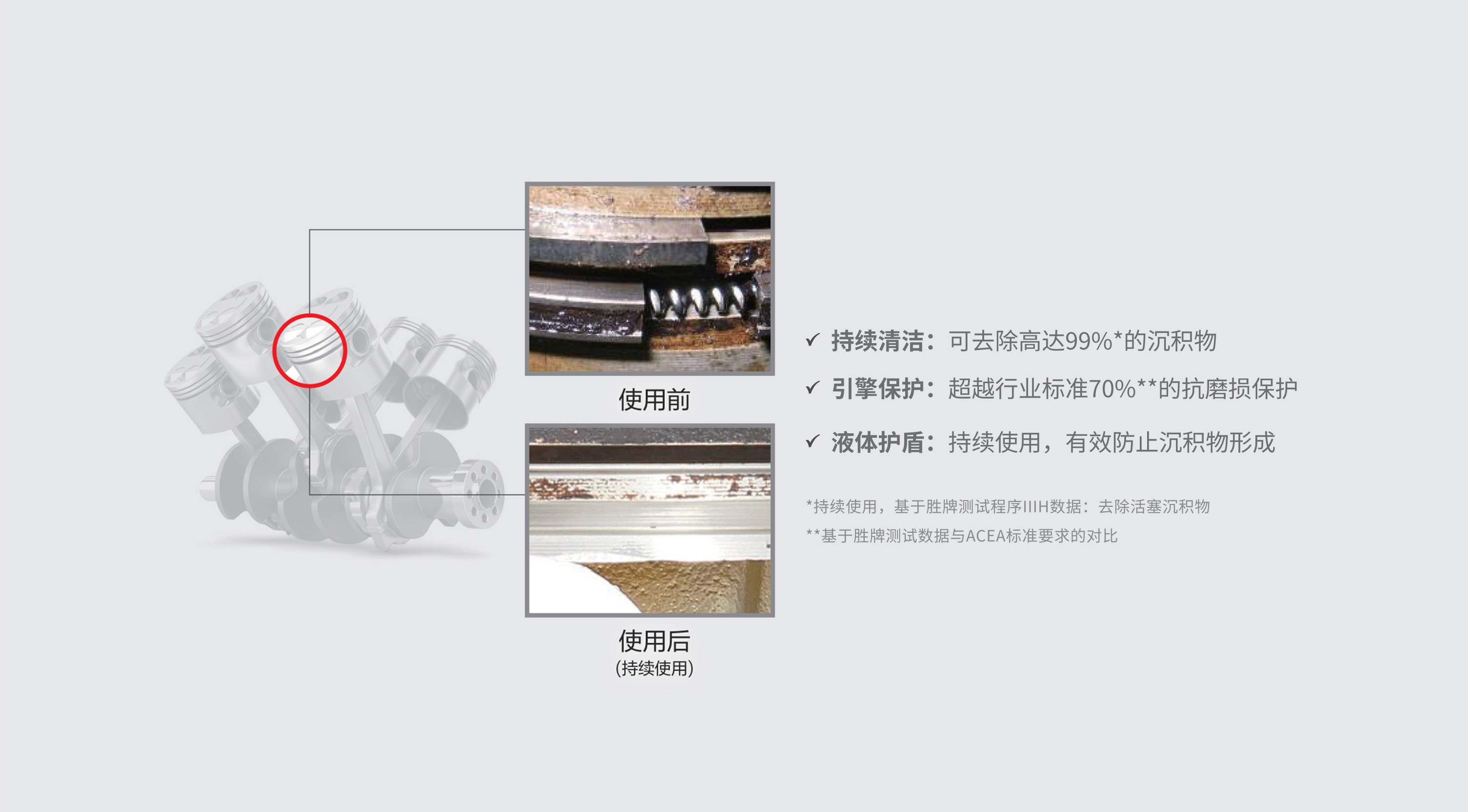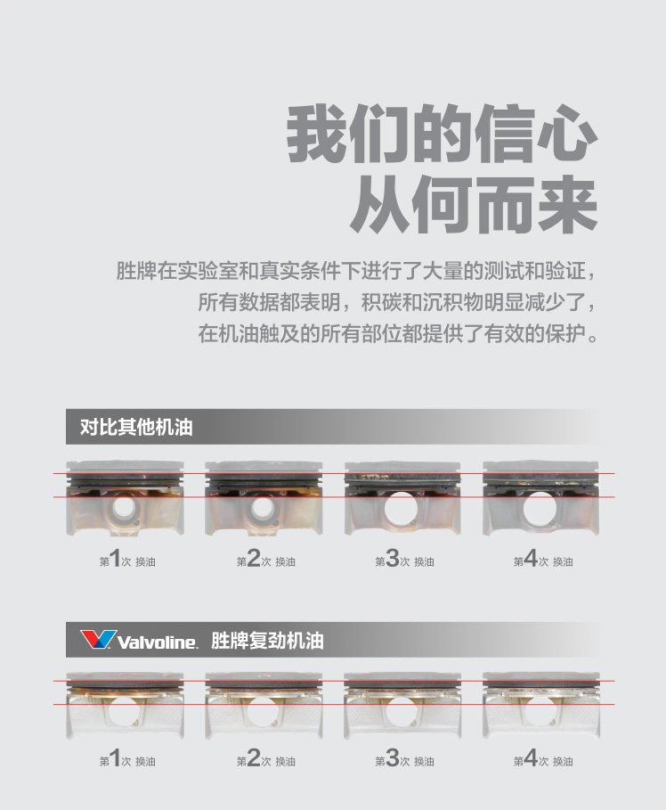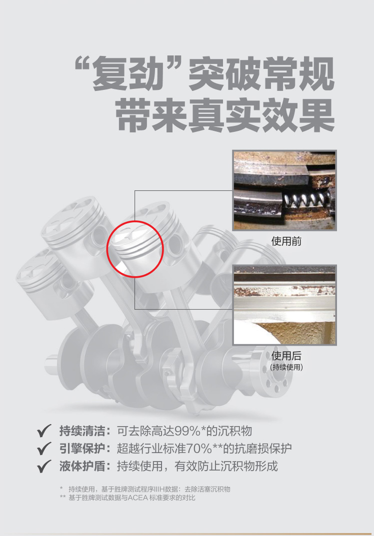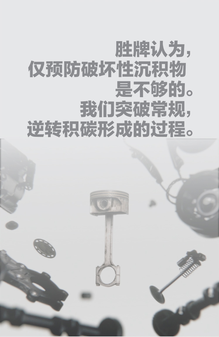 勝牌在實驗室和真實條件下進行了大量的測試和驗證,所有數(shù)據(jù)都表明,積碳和沉積物明顯減少了,在機油觸及的所有部位都提供了有效的保護。